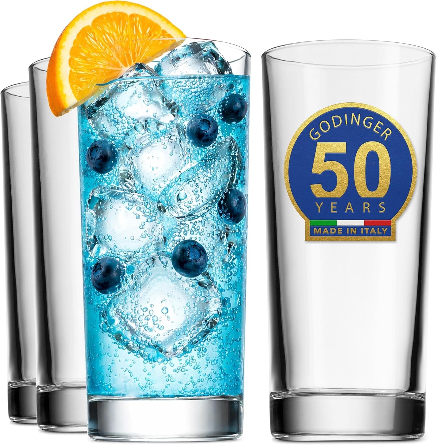 Elevate your drinkware collection with the Godinger Highball Drinking Glasses, expertly crafted in Italy. This set of four 14oz tall glasses boasts a sleek, modern design with a thick, stable base—perfect for cocktails, whiskey, water, and more. Lead-free and dishwasher safe, these versatile glasses make an impressive gift for any occasion. Add elegance and functionality to your barware with this timeless set from the Godinger Store.
